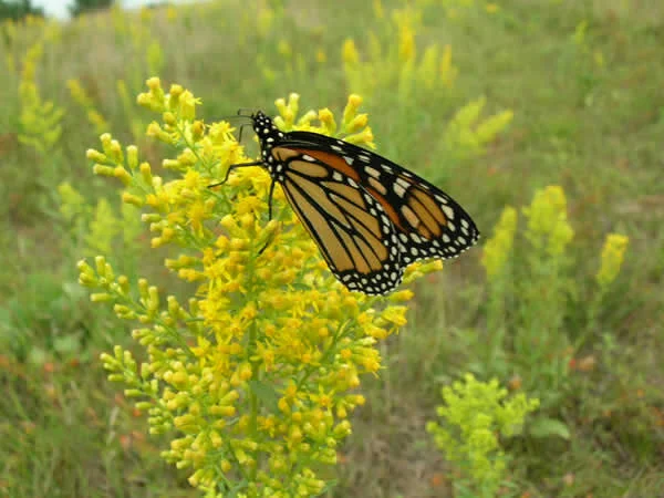 Solidago speciosa (Showey Goldenrod) and Monarch butterfly – Prairie Moon Nursery