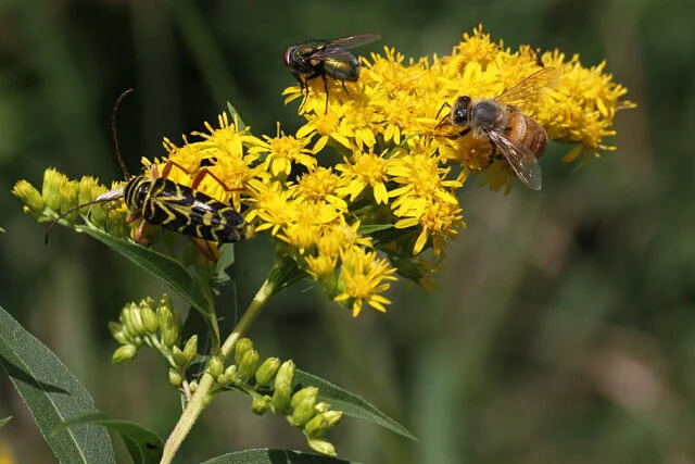 Pictured from left to right are a long-horned beetle (locust borer, Megacyllene robiniae – pollen eater), a fly (nectar feeder) and bee (nectar and pollen feeder).- Mary Holland
